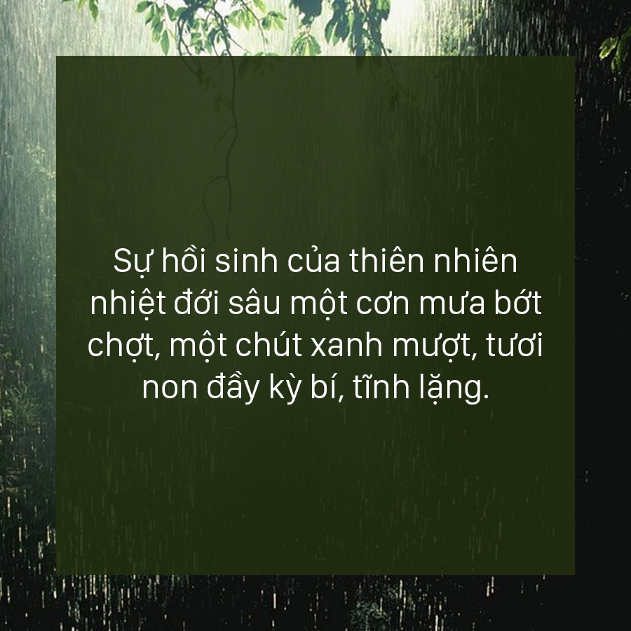 Cơn mưa đầu mùa chợt xuất hiện xoa dịu đi hết thẩy những bức bối. Từ đây, thiên nhiên bắt đầu hồi sinh đầy kỳ bí, cỏ cây dậy mùi xanh mướt, tươi mới, rêu non ướt quyệt sương đêm hòa thêm hương gỗ trầm ấm, mê ảo. Mùi hương phấn kích đầy bí ấn khiến tâm trí tò mò dõi theo mà khám phá.