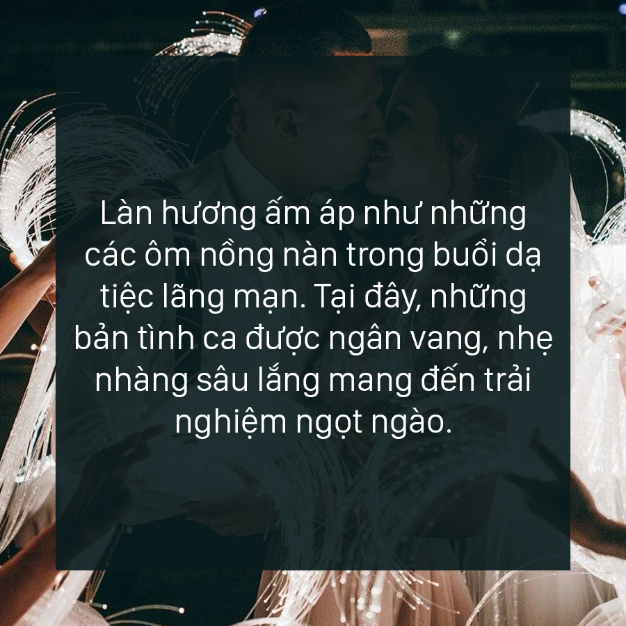 Ấm áp như những các ôm nồng nàn trong buổi dạ tiệc lãng mạn.Tại đây, những bản tình ca được ngân vang, nhẹ nhàng sâu lắng mang đến trải nghiệm ngọt ngào.